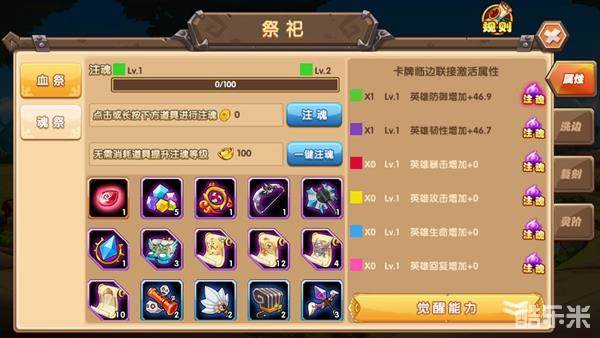 每一种祭祀的所产生的效果都不一样,血祭可以增加英雄的基础属性,魂祭主要是增加连击的伤害,而人鬼在英雄生命低至一定临界,可以降低来自敌方的伤害。不同的祭祀阵法还有着自己特殊的觉醒能力,可以更大幅度地提升基础属性。