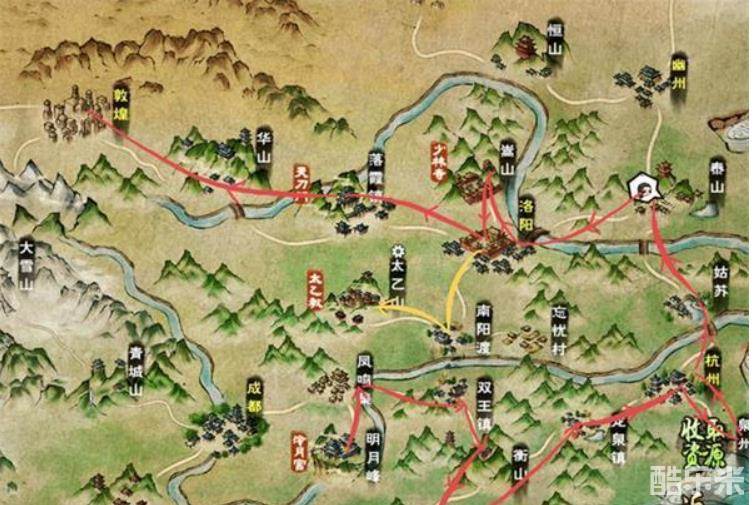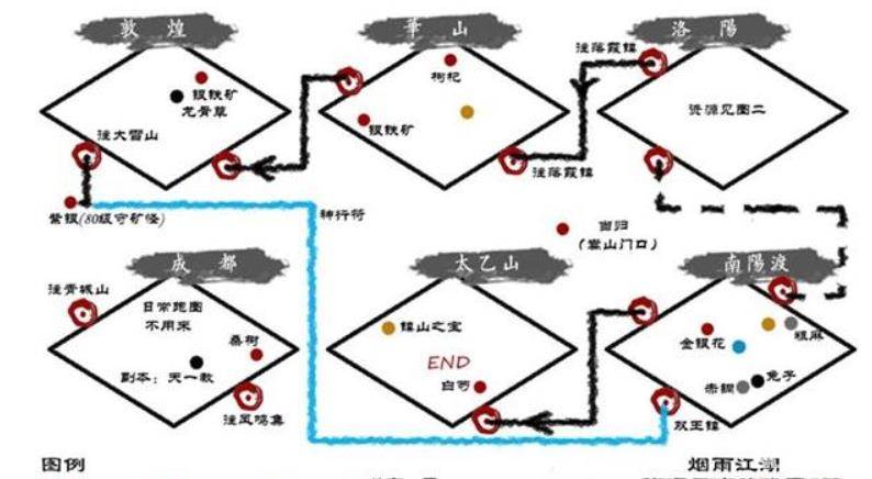 该路线起始点为明月峰,将会首先经过资源密集区,逆时针旋转至敦煌(大雪山)后飞回双王镇再往上搜集南阳与太乙山资源,最大限度节省车马费。路线未经过的城市大多为穷乡僻壤,可忽略。
