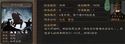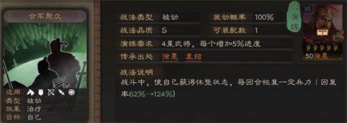 分析:战法能够给予自身稳定的续航能力,并且恢复量受总兵力影响,所以任何武将都可以使用。不过最好是配给肉盾武将增加其生存力。