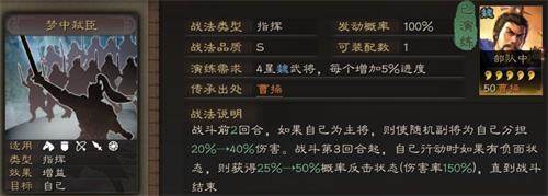 指挥战法【梦中弑臣】:战斗前2回合,如果自己为主将,则使随机副将为自己分担伤害。战斗第3回合起,自己行动时如果有负面状态,则获得概率反击状态,直到战斗结束。
