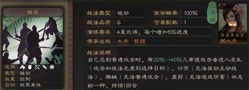 被动战法【魅惑】:自己受到普通攻击时,有几率使攻击者进入混乱、计穷、缴械、虚弱状态的一种,持续1回合。