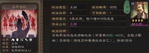 分析:战法非常实用,不仅容易获得,还拥有全游戏最稳定的反击效果。是嘲讽、援护武将必备的神技。