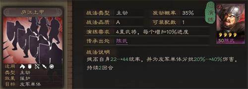 主动战法【庐江上甲】:提高自身统率,并为友军单体分担伤害,持续2回合。