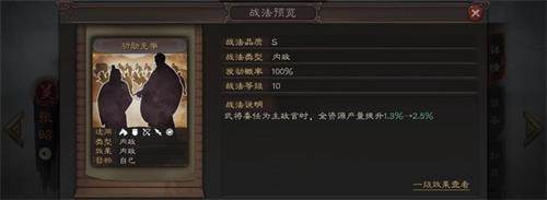 然后再看内政战法的描述,是不是就很清楚了呀。发动条件就是该武将委任为主政官时,有描述的收益。我称之为功能性武将,不是简单的拿到武将就看属性,不好就看传承战法,好就拆了,不好就当材料将。