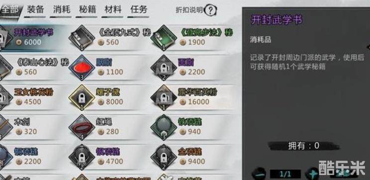 2、各个迷宫开宝箱也是有几率掉武学书,商店也会卖武学书,赌人品可以去商店买买试试看(下图)