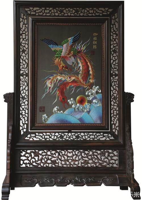 孙庆先代表作品《丹凤朝阳》(作为国礼品赠送英国首相、俄罗斯总统的K金立体双面垫绣立屏)