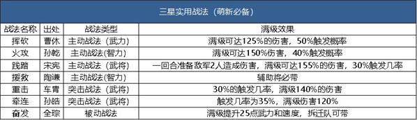 该战法触发几率高达50%,满级可达125%的伤害。虽然就伤害而言,并不是特别高,但是50%的触发几率,在前期开荒中非常实用,只要触发成功,就能造成不俗的伤害。而且首充赠送的孙坚和孙策都属于物理将,都适合带挥砍。