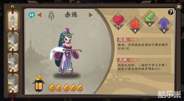而赤炼的武学相当简单粗暴还好用,升级效果为疯狂4(该牌额外打出四次),同时具有攻击相关;这意味着我们进图升级后就能打出6*(12+攻击)的伤害,相当优质。但与此同时,这奠定了她究极打工仔的地位,能帮刺客渡过前期,但后期伤害就显得不够看了(排除面板竹林)。