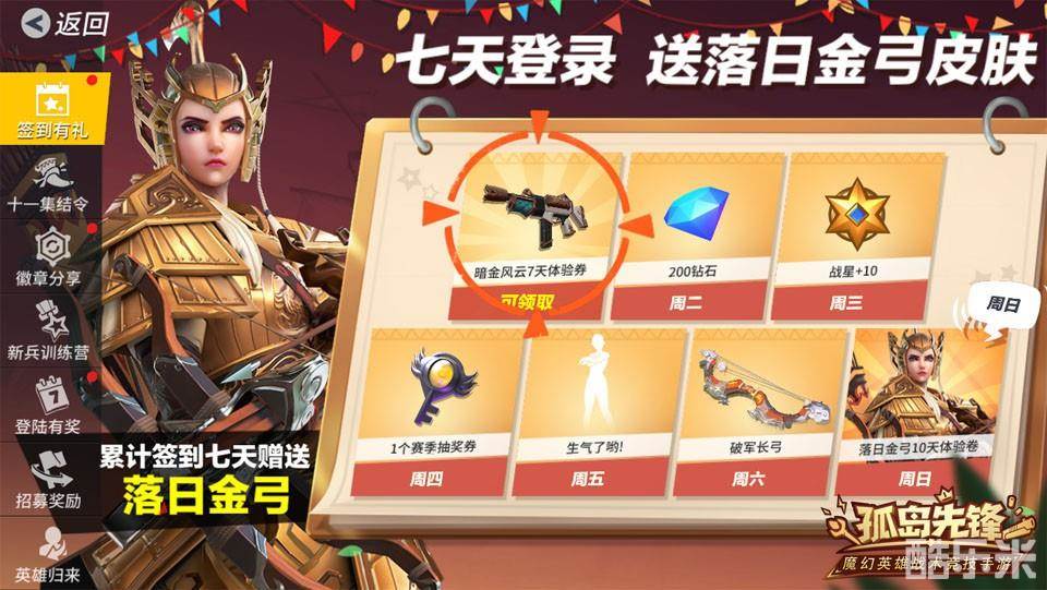 从10月7日起开启的节后七天签到活动,还将为玩家带来钻石、战星、赛季抽奖券、枪械皮肤体验券等奖励,以及橙色品质的乌鸦长弓皮肤“破军长弓”和密林猎手传奇皮肤“落日金弓”10天体验券,带你免费体验天神级猎手的酷炫!