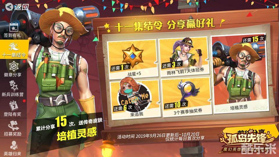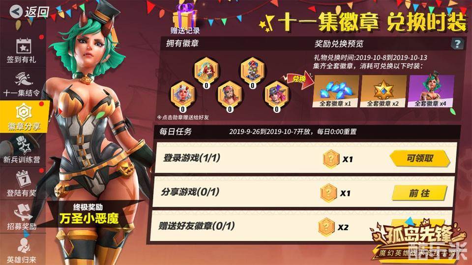 值此国庆佳节即将到来之际,《孤岛先锋》也为玩家准备了多重节日惊喜。9月26日更新后至10月20日,玩家每日分享游戏都可以获得分享次数,次数可用于获取战星、喷漆、赛季抽奖券、英雄皮肤体验券以及永久英雄皮肤等奖励。