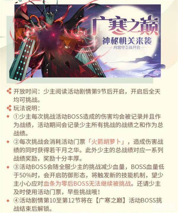 ②每次挑战会消耗活动门票「火箭胡萝卜」,造成伤害战绩的同时获得若干月之华。此外少主的总战绩对应一-系列战绩奖励,奖励十分丰厚。