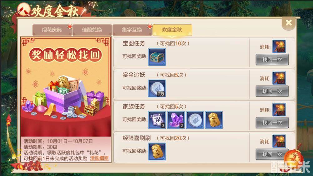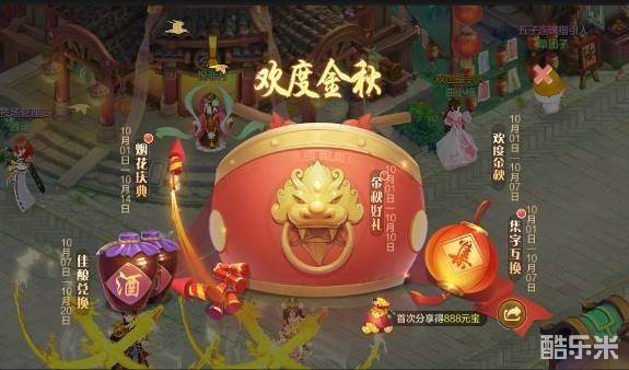 金秋好礼,7个节日馈赠礼包连环送,礼包必得888元宝;佳酿兑换,饮酒重阳,东方之珠(时装)等福利唾手可得;欢度金秋,烟花解锁未完成活动奖励,轻松赚得钵满盆满;集字互换,完成任务或与好友互换卡,玉枝月握(武器时装)、月恋蝶(背包时装)等福利人人有份。此外,“烟花庆典”、“冲锋之星”和“最强修罗王”活动同步上线,1000元宝等福利全民疯抢中!