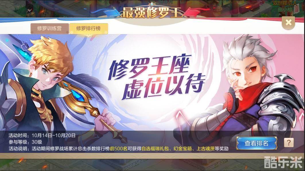 “冲锋之星”之后,“最强修罗王”活动接棒来袭!10月14日至10月20日,玩家参与修罗战场并完成相应任务就能获得额外惊喜福利,包括500元宝、培元丹、元宝福袋、战场积分等。与此同时,玩家在修罗战场的击杀数也将入围“击杀榜“,根据最终排名解锁自选大宝箱、上古魂匣等奖励。