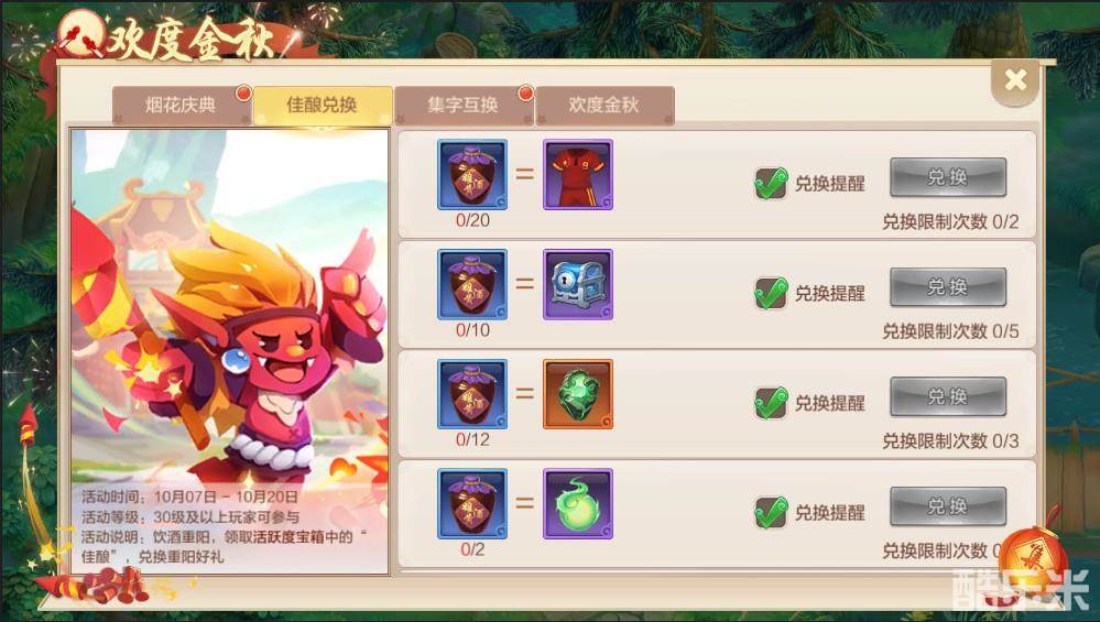 10月7日至10月20日,玩家还能邀上三两知己在幻想大陆举杯共饮!活动期间,玩家每天领取活跃度宝箱时可获得“佳酿”;该道具可用于兑换东方之珠(时装)、五行幻魂、龙脉之心、龙脉精华、培元丹等奖励。品美酒,赢奖励,如此乐事怎能错过。