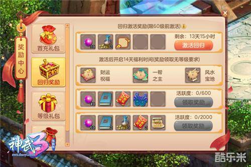 活动期间,已激活的回归玩家进入新服后,可获得“新服回归奖励”活跃礼盒,达成一定活跃度时即可获得对应阶段奖励。活跃礼盒中包括帮派红包、头像券、紫灵玉等奖励。更有三重福利状态加持:“财运祝福”状态下首次充值更划算,“一帮之主”享8折建帮费用优惠,“风水宝地”提升房屋风水等级,助你轻松建造家园。