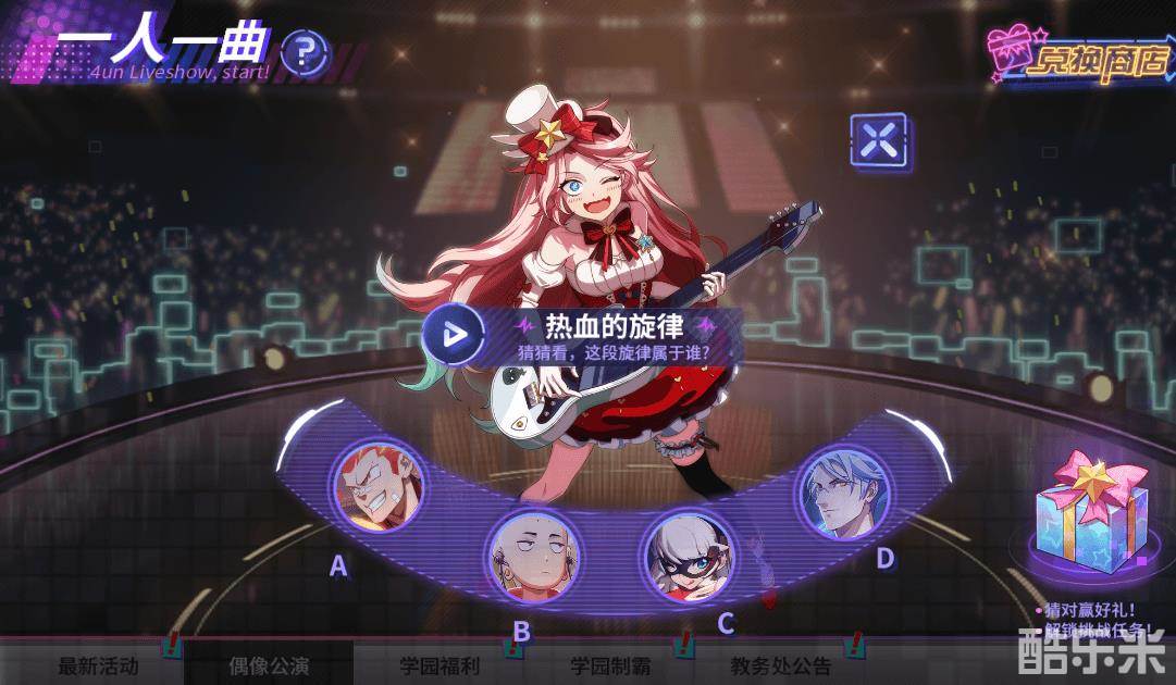 金秋学园祭,即将在少女偶像乐队4un的公演中拉开序幕。与此同时,CallCall杯偶像应援战也将打响。主唱狮妹、鼓手玉子、键盘手文曲星和贝斯手琰萝,谁是你最爱的乐队成员呢?快报名加入应援阵营,一路打上冠军为你的偶像应援吧!获胜队伍将会获得特殊的订制应援道具,同时会为爱豆增加曝光资源喔!