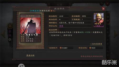曹真分解可得。伤害最高的瞬发的主动战法。伤害率高达:物理150%+法术150%。非常适合物理和智力双高的武将。
