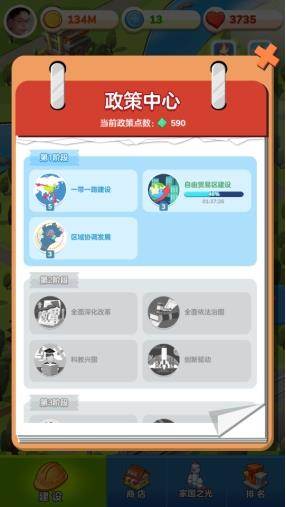 想要学习了解中国这些年实施了哪些重要的政治、经济等领域的政策或措施吗?你只要点开游戏中特别设计的“政策中心”,包括“一带一路建设”、“自由贸易区建设”、“全面深化改革”、“精准扶贫”、“拍蝇打虎猎狐”、“美丽中国”等等在内的一系列政策不仅可以让你的城市更稳健,更快速的发展,你也可以从中学习到更多新的知识。