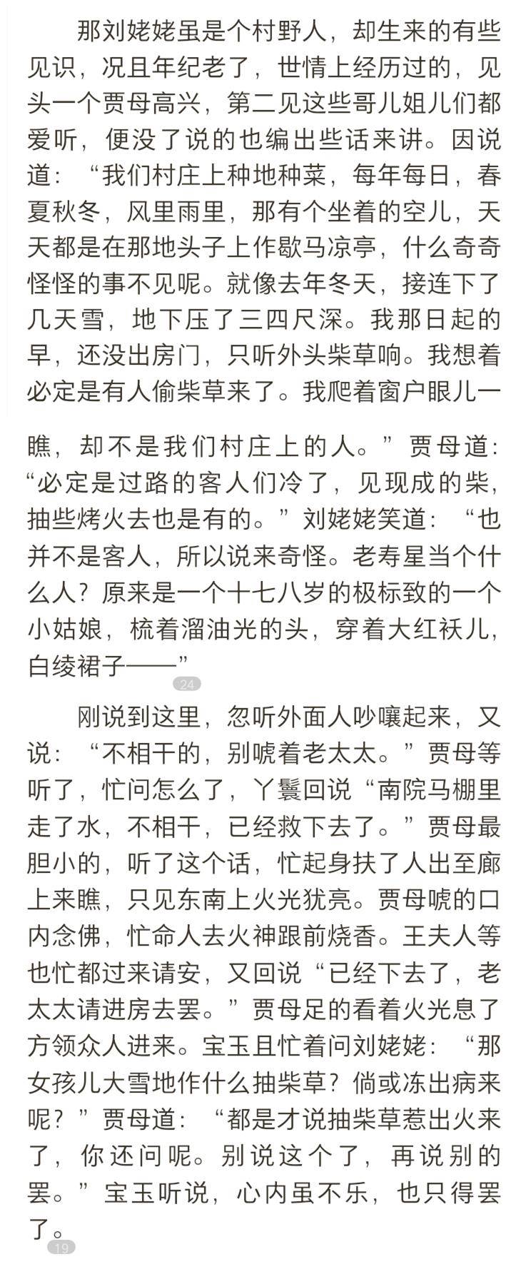再比如,第三十九回刘姥姥二进荣国府,被平儿和周瑞家的拉到了贾母屋里,同贾母众人说话聊天。刘姥姥为了逗众人开心,于是编了故事讲给大家,第一个讲的便是“茗玉雪中抽柴”的故事。原文如下: