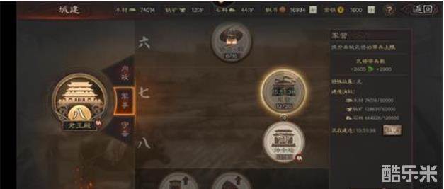 第四:为什么出7本?因为军营,军营增加带兵数量,三将无能万兵来凑,中心思想,不怕你钛金将好技能强,我兵多照样能打高级地。金珠不止用来五连还可以秒建筑,主要前期用来秒7.8.9级仓库和4.5.6.7主城看资源和需要程度决定,推荐有好将缺统御时候秒。后面资源多了可以快速秒军营多带兵出征。