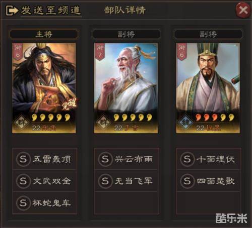 5、 Q:为什么这么配?A:程昱是三战中S1赛季唯一的群体禁疗武将,虽然是条件禁疗,但是负面状态的覆盖面极大,Dot和Debuff都算是负面状态。由于程昱本身速度较慢,可以利用无当飞军和于吉的指挥技能稳定的分别在首回合对2目标,二回合对3目标造成瞬发群体伤害,保证输出,而张角可利用主将效果对敌人进行高概率控制,确保队伍的强度。唯一要注意的就是于吉的统帅极低,容易被爆造成减员,但于吉全指挥低武力的特性,可以使用自残型技能提升自身强度例如黄天和诈降。
