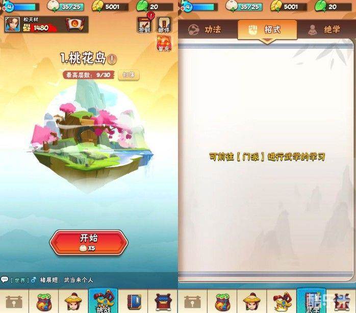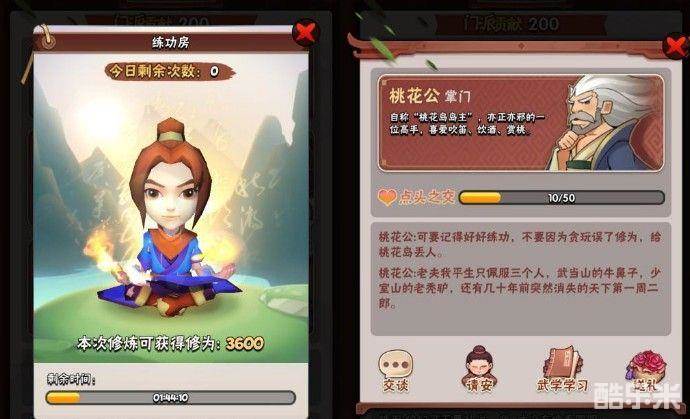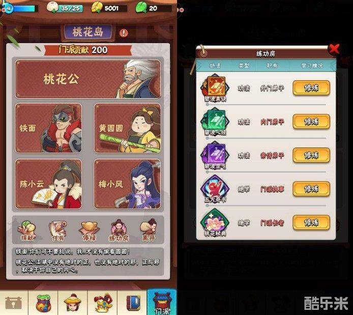 玩家们一开始进入的门派,一般是桃花岛,可以在桃花公的练功房里进行武学的学习,来提升自身的属性,可以独自修炼,也可以让桃花公对你进行传功,需要花费金叶子和翡翠叶子,同时需要等待一段时间才可以完成修炼。同时可以做门派任务,而做门派任务也就是点一下就开始进行,时间较长(8小时,估计这种手游是给社畜玩的,下班正好受奖励)每天可以领取一定的俸禄,俸禄会随着在门派中等级的升高而变多。