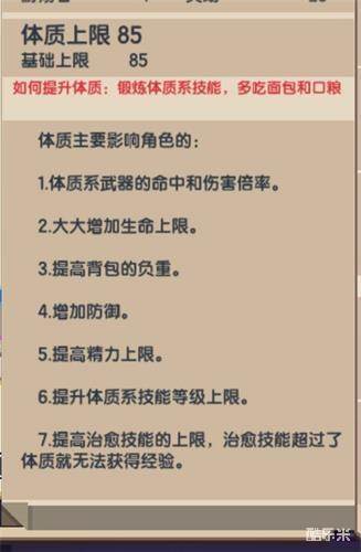 体质大幅度的提高生命上限,还有我们的护甲专精上限,对于战士来说这个十分重要,你没有肉度你甚至无法接近法师系的怪物,要玩战士首先要会抗打。