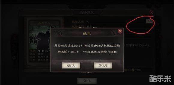 如果是携带的战法,点击进入后,右上角会有遗忘按钮。点击遗忘按钮,该武将会遗忘该战法,并返还80%的战法点。(友情提示:新手期返还100%战法,新手玩家需要好好珍惜这段时间)