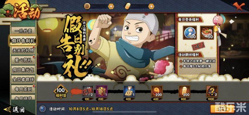 10月8日5点~10月18日5点,游戏内上线“假日告别礼”福利活动,每日登录领取福利值,福利值达到指定数量即可领取奖励。此外在活动期间,丰饶之间可免费一键完成,每日还可额外获得3次秘境扫荡次数。