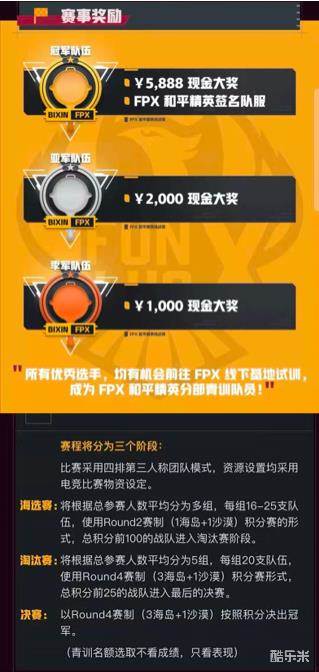 梦想加入职业战队的高玩们可以在比心App上提交报名申请,经过层层淘汰赛筛选和决赛的最终对决,冠军战队将获得5888元现金大奖,在比赛中表现出色的玩家有机会加入FPX和平精英青训队,成为职业选手,走上职业赛场。