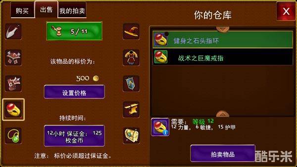 在分页中点击“出售”,在对应的装备/物品分类中可看到仓库中多余的可拍卖的装备。点击装备,设置价格再点击拍卖物品即可。注意的是,拍卖价格必须高于保证金。每次玩家在拍卖行中寄售物品时,系统将收取一定的保证金,该物品交易成功后,不再收取额外的佣金。