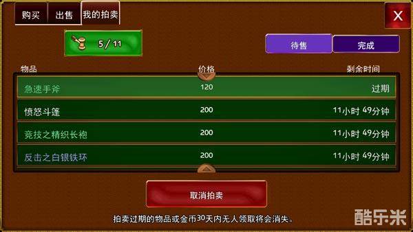 在“我的拍卖”中,玩家可查看自己正在拍卖行中出售或者已买成售卖的物品,点击物品可取消该物品的拍卖。