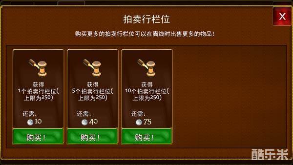 当玩家有较多物品需要在拍卖行交易时,点击“我的拍卖”下方的拍卖栏位按钮,可选择用铂金币增加更多的拍卖栏位。