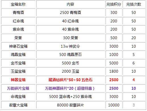 5. 二重惊喜奖励中的紫色神器碎片为单服消费排行榜专属神器“七妙宝树”,可更换为一半数量的紫色万能神器(例如:单服排行榜第五名玩家消费达到4w金币,领取奖励后,可以联系在线客服申请将160个七妙宝树碎片,更换为80个紫色万能碎片)。