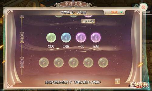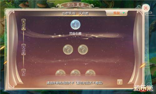 人物等级≥1转80级的玩家可以组成人数≥3的队伍,对“南斗星象”副本进行挑战。在25分钟规定时间内,玩家可以在每一层的星君中任一选择其中一位进行挑战,挑战成功后,即可选择挑战下一位星君。每位星君都有自己的品质,品质不同挑战难度也不同,绿、蓝、紫、橙的品质难度依次提高,相对应的,打败星君后所获得的经验奖励也会依次提高。