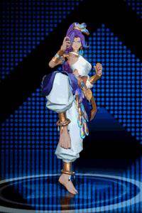 洁白的抹胸背心、宽松的运动裤子,再加上金色臂甲,斜披在腰间与点缀在腿脚处孔雀翎羽,在符合金吒对运动性要求的同时,也衬托出一份难得的优雅。长辫染成紫色,搭配上金色发饰,一拳一脚之间轻盈甩动,炫如流光,整体看上去又透出一种异域风情。