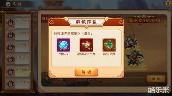 解锁阵型需要用到解锁材料,普通阵型只需要用到列阵石,而高级阵型还需要用到高级阵法密卷和阵法书卷,高级阵型增加的属性也比普通阵型要高。