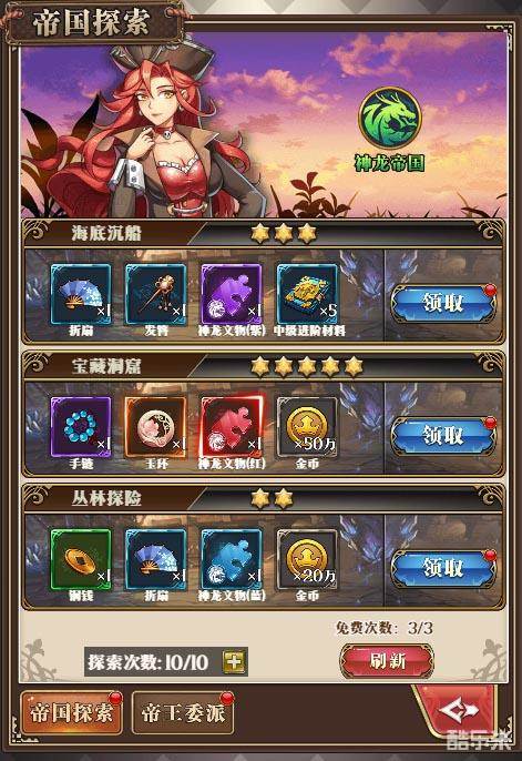 探索任务每日可免费刷新三次,要是在三次内刷不出满意品质的任务,玩家亦可选择消耗钻石进行刷新。玩家在领取探索任务以后,需要等待一定的时间方可完成任务。