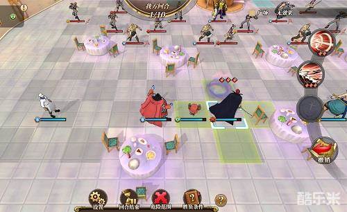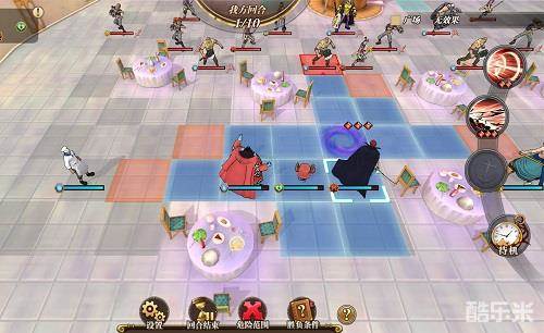 了解了角色天赋和场地之后,就可以开始历险了么?可惜还是不够。接下来我们要看一下角色的移动范围、攻击范围与技能攻击。以红发为例,当我们点击红发时会出现这样的画面,蓝色区域就是红发的移动范围。
