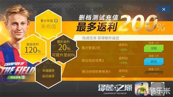 本次测试为计费删档测试,玩家在本次测试中充值的点券,将在《绿茵之巅》公测开启后进行返还。最终充值返还比例由【基础比例】和【额外比例】两部分构成。完成活动任务可提升【额外比例】,最高可返还200%!