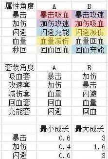 每级成长:暴击0.6~3。加伤0.4~1.6。闪避0.3~3。血量0.4~2。秒回0.04~0.2。