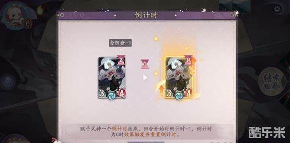 1、在我们触发“倒计时”效果时,对应式神卡右上角会显示沙漏标识并配有数字,数字象征着回合数,每回合-1,当减为0时触发二段效果。比如大天狗的“倒计时”效果为:再次使用该法术,简单理解就是我们使用一张法术牌,触发“倒计时”效果,沙漏开始倒数回合,当倒数到0时,会再次触发我们之前使用的那一张法术牌效果。