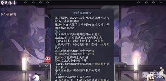 在“天梯”中,客人们将匹配到实力相近的对手进行对局,赢得比赛会获得“鬼火”(这里的鬼火并不是对战中行动消耗的鬼火,而是提升段位用的)、金币、秘卷、头像和达摩铜币等奖励。