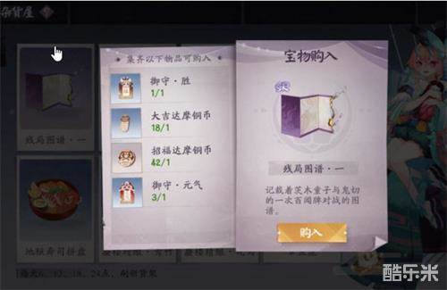“残局图谱.一”是解锁剧情的的重要特殊道具,但是难以在杂货屋中见到,且需要“御守.胜”和“御守.元气”两个稀有道具,配合货币才能兑换,客人们看到杂货屋里的这几个道具时,可以选择提前兑换。