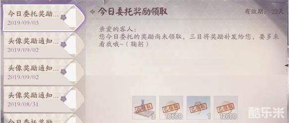 2.任务完成后,到案内所点击“领取”按钮获得奖励。如果当天完成了任务,但没有领取奖励,系统会在任务刷新后,通过“邮件”形式补发,不过邮件可是会过期的哟,千万不要忘记收取。