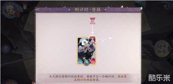 倒计时:当使用有“倒计时”效果的卡牌时,会赋予式神倒计时效果,自己的回合开始时到倒计时数字减一,数字归0时效果触发并重置倒计时。需要注意的是,一个式神只能存在一个倒计时效果,新的倒计时会替换原来的倒计时状态。