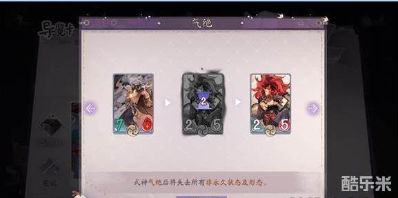 气绝状态:卡牌变为黑白,有黑气环绕。“气绝”的式神无法战斗,也无法使用该式神的卡牌(个别卡牌除外,如犬神的“心即归处”),每个己方回合开始时倒计时减少1,倒计时归零后式神回到场上,式神气绝后,所附加的所有非永久形态和状态会消失,所以尽量避免式神陷入气绝。