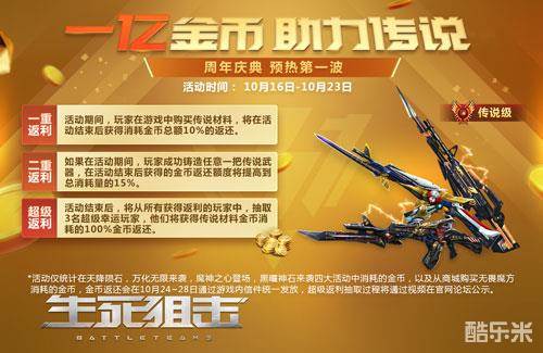 谁说金币与传说不可兼得?一亿金币够大家冲刺传说了吗?10月16日至23日活动期间,只要玩家在游戏中购买任意传说材料,都将获得一定比例金币返利。