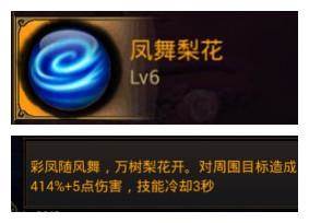 【凤舞梨花】:群体技能,但由于释放时不能够移动,而神箭妖姬是一个远程职业,生存力不强,在自身装备不好的情况下容易被boss技能打中,不建议选择装备;
