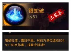 【银蛇破】:远程控制伤害技能,能够冰封敌人少量时间,而且距离很远,对于远程来说是个福利,所以果断装备了。
